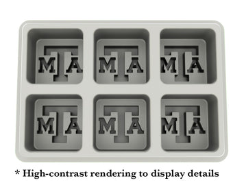 This 2-piece starter set provides a 6 cube cavity casting tray featuring Texas A&M University's Block ATM, along with a secure, interchangeable lid to keep your castings clean and safe. Each cube is 1.75" along each plane for a total of 5.36 cubic inches, with the Block ATM rising almost half an inch above its base. Combined, the lid and tray measure at 6.5" long, 4.5" wide, and 2.25" tall. Made of food grade safe silicone, this tray and lid set are durable, reusable, and safe to use across the freezer, oven, and dishwasher to meet your casting needs. Most importantly, AlumniMolds is officially licensed by Texas A&M University for direct to consumer sales.